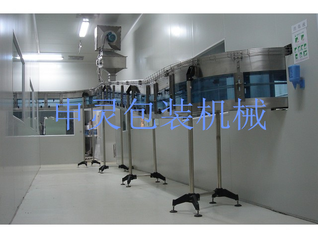 PET空瓶(衛生型)風道輸送線 PET空瓶(衛生型)風道輸送線是利用風機的風能作為輸送動力,配以儲風的輸瓶風道,實現了從吹瓶機生產出來的空瓶直接輸送到灌裝機或貼標機進行灌裝或貼標。風道主體結構件均采用304不銹鋼制作,能抵抗各種弱酸、弱堿等腐蝕,風道卡瓶條為超高分子聚乙烯材料,摩擦阻力小,耐磨強度高,能保證較長的使用壽命。整線電氣系統采用PLC、人機界面、變頻器和光電傳感器控制。它能夠減少空瓶的二次污染,節省包裝成本和節約人工費用。該系統具有節能、結構緊湊、外型美觀、控制簡便、易調整、易清潔等特點,符合食品、包裝行業的衛生要求,是一種理想的輸瓶機械設備。    PET空瓶風道輸送線由風機動力裝置、直行風道、轉彎風道、上下坡風道、分合流裝置、落瓶裝置以及夾瓶裝置等結構組成。 技術參數: 名稱 數值 備注 整線生產能力 >60000BPH 以600ml空瓶計算 風道輸瓶速度 2.5~6m/s 以600ml空瓶計算 風道輸瓶單只最大重量 120g 風機功率 2.2KW 2880rad/Min 風量 2840m3/h 配變頻器調節 風壓 600~1000Pa